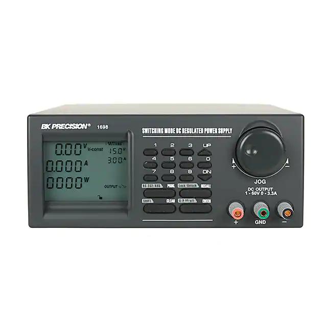 This is manufactured by B&K Precision. The manufacturer part number is 1698. It is assigned with possible HTSUS value of 8504.40.9530. The product is not applicable. Its typical moisture sensitivity level is not applicable. It comes in bench (ac to dc) configuration. In addition, it is reach unaffected. While, the output current includes 0 ~ 3.3a. It is shipped in box. The product's diameters include 8.460" l x 7.600" w x 3.850" h (214.88mm x 193.04mm x 97.79mm). Consists of 4 characters. It features a remarkable lcd display. The splendid features of the product include programmable, rs232 port, software, switching. The typical product's weight is 6.6 lbs (3 kg). Furthermore, the output voltage is 1 ~ 60vdc. It has optimum voltage supply of 90 ~ 265vac. Additionally, the product is supplied with 1 outputs. The product is designated with the ear99 code number