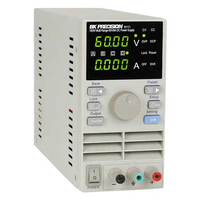 This is manufactured by B&K Precision. The manufacturer part number is 9111. It is assigned with possible HTSUS value of 8504.40.9530. The product is not applicable. The product features power and watts of 180w. Its typical moisture sensitivity level is not applicable. It comes in bench (ac to dc) configuration. In addition, it is reach unaffected. While, the output current includes 0 ~ 8a. It is shipped in box. The product's diameters include 11.110" l x 3.470" w x 6.900" h (282.19mm x 88.14mm x 175.26mm). Consists of 3, 4 characters. It has a long 20 weeks standard lead time. It features a remarkable led display. The splendid features of the product include memory, mixed linear/switching mode. The typical product's weight is 7.7 lbs (3.5 kg). Furthermore, the output voltage is 0 ~ 60vdc. It has optimum voltage supply of 110vac, 220vac. Additionally, the product is supplied with 1 outputs. The product is designated with the ear99 code number