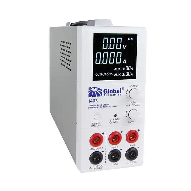 This is manufactured by Global Specialties. The manufacturer part number is 1403. It is assigned with possible HTSUS value of 8504.40.9520. The product is rohs compliant. The product features power and watts of 100w. Its typical moisture sensitivity level is 1 (unlimited). It comes in bench (ac to dc) configuration. While, the output current includes 0.25 ~ 5a. It is shipped in box. The product's diameters include 9.800" l x 2.800" w x 6.000" h (248.92mm x 71.12mm x 152.40mm). Consists of 4 (2) characters. It has a long 12 weeks standard lead time. It features a remarkable lcd display. The splendid features of the product include selectable output. Furthermore, the output voltage is 1 ~ 20vdc. It has optimum voltage supply of 100 ~ 240vac. Additionally, the product is supplied with 3 outputs. The product is designated with the 3a992a code number