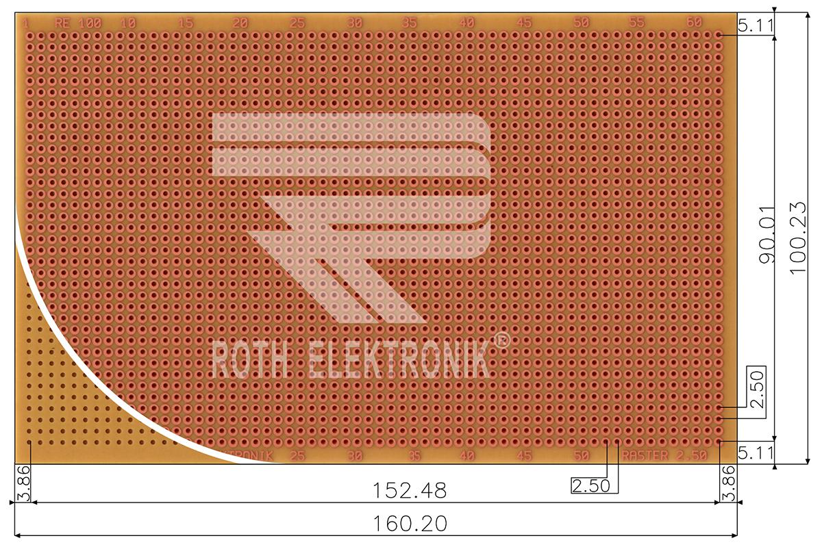 This is Single Sided Eurocard PCB FR2 with 37 x 56 1mm Holes 2.5 x 2.5mm Pitch 160 x 100 x 1.5mm manufactured by Roth Elektronik. The manufacturer part number is RE100-HP. The given dimensions of the product include 160.20 x 100.23 x 1.5mm. It is 1.5mm thick. Furthermore, the product is 100.23mm wide. Its accurate length is 160.20mm.