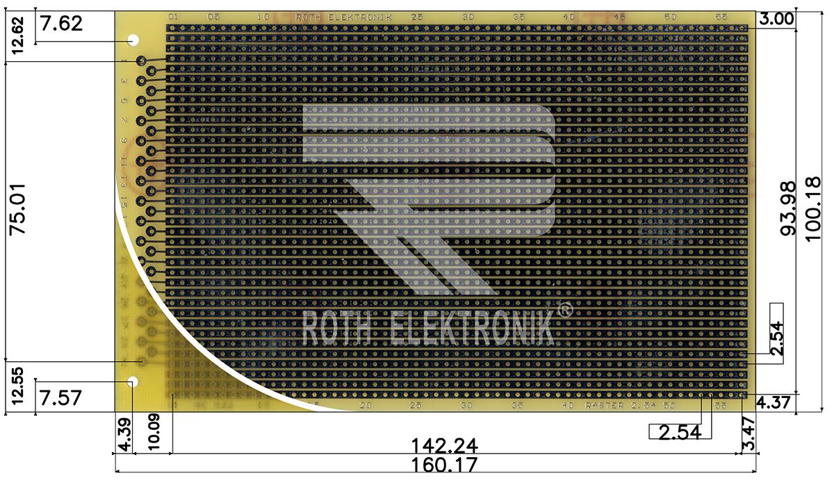 This is Single Sided DIN 41617 Eurocard PCB FR4 with 37 x 57 1mm Holes 2.54 x 2.54mm Pitch 160 x 100 x 1.5mm manufactured by Roth Elektronik. The manufacturer part number is RE522-LF. The given dimensions of the product include 160 x 100 x 1.5mm. It is 1.5mm thick. Furthermore, the product is 100mm wide. Its accurate length is 160mm.