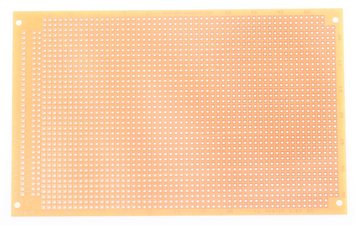 This is Single Sided DIN 41612 C Eurocard PCB FR2 with 37 x 55 1mm Holes 2.54 x 2.54mm Pitch 160 x 100 x 1.5mm manufactured by Roth Elektronik. The manufacturer part number is RE319-HP. The given dimensions of the product include 160 x 100 x 1.5mm. It is 1.5mm thick. Furthermore, the product is 100mm wide. Its accurate length is 160mm.