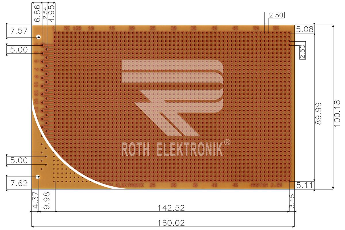 This is Single Sided DIN 41617 Eurocard PCB FR2 with 37 x 58 1mm Holes 2.5 x 2.5mm Pitch 160 x 100 x 1.5mm manufactured by Roth Elektronik. The manufacturer part number is RE120-HP. The given dimensions of the product include 160 x 100 x 1.5mm. It is 1.5mm thick. Furthermore, the product is 100mm wide. Its accurate length is 160mm.