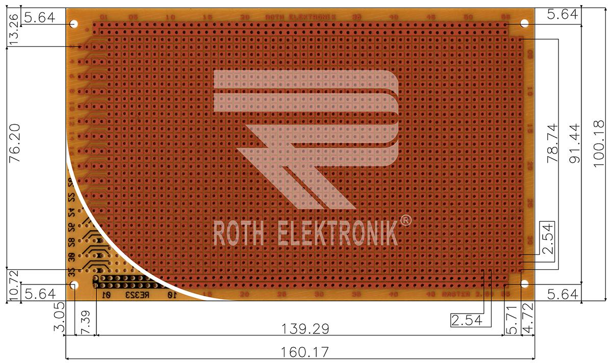 This is Single Sided DIN 41612 D/E/F Eurocard PCB FR2 with 32 x 55 1mm Holes 2.54 x 2.54mm Pitch 160 x 100 x 1.5mm manufactured by Roth Elektronik. The manufacturer part number is RE323-HP. The given dimensions of the product include 160 x 100 x 1.5mm. It is 1.5mm thick. Furthermore, the product is 100mm wide. Its accurate length is 160mm.