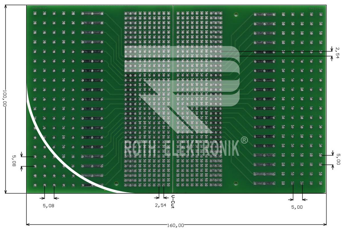 This is Double Sided Eurocard FR4 With 5 x 19 7 x 37 1.1mm Holes 2.54 x 2.54 mm 5 x 5 mm 5.08 x 5.08 mm Pitch manufactured by Roth Elektronik. The manufacturer part number is RE640-LF. The given dimensions of the product include 160 x 100 x 1.5mm. It is 1.5mm thick. Furthermore, the product is 100mm wide. Its accurate length is 160mm.