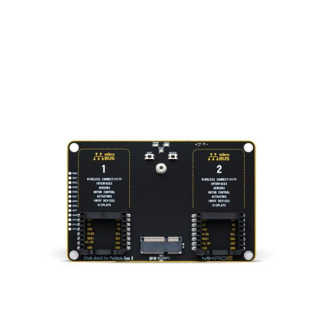 The MIKROE-4506 Click Shield is an add-on board that can be used with Particle Gen 3 development kits. It is produced by MikroElektronika, a company specialising in designing and producing hardware and software tools for microcontroller-based systems. The Click Shield provides a simple and convenient way to add various functionalities to Particle Gen 3 boards.
