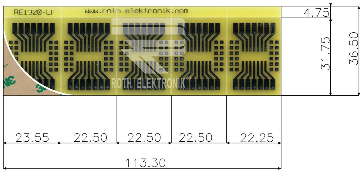 This is PCB Adapter SM Epoxy Glass Single-Sided 113.3 x 36.5mm FR4 manufactured by Roth Elektronik. The manufacturer part number is RE1320-LF. The given dimensions of the product include 113.3 x 36.5 mm x 0.8mm. It is 0.8mm thick. Furthermore, the product is 36.5mm wide. Its accurate length is 113.3mm. It comes in universal board configuration.