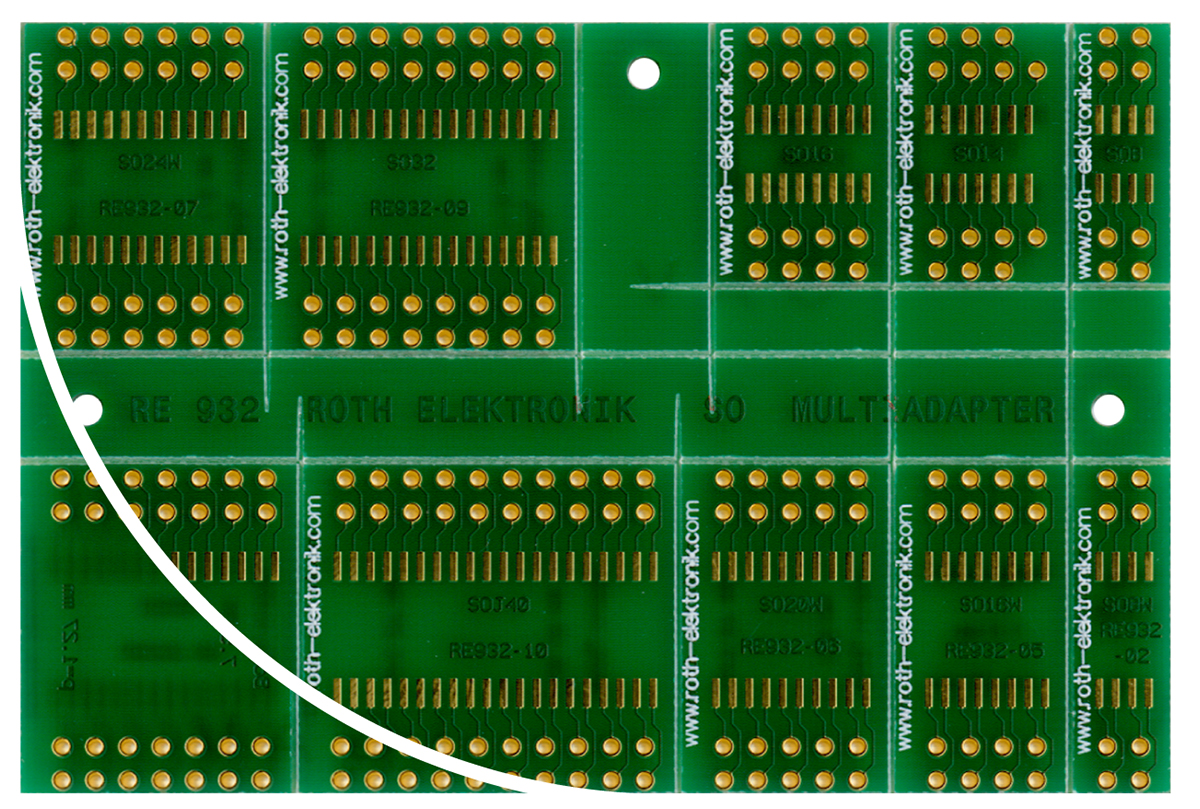 This is Surface Mount (SMT) Board SO SOJ Epoxy Glass Double-Sided 87.94 x 58.95 x 1.5mm FR4 manufactured by Roth Elektronik. The manufacturer part number is RE932. The given dimensions of the product include 87.94 x 58.95 x 1.5mm. Furthermore, the product is 58.95mm wide. Its accurate length is 87.94mm. It is 1.5mm thick. It comes in multi adapter board configuration.