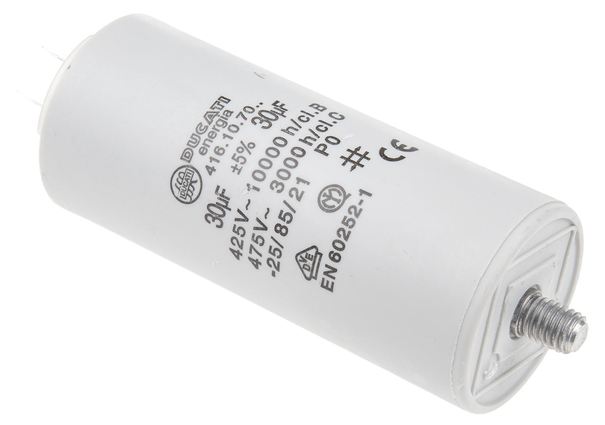 This is 30μF Polypropylene Capacitor PP 450V ac ±5% Tolerance Stud Mount 4.16.10 Series manufactured by Ducati Energia. The manufacturer part number is 4.16.10.70.64. The given dimensions of the product include 40 (dia.) x 92mm. The product is available in stud mount configuration. The product 4.16.10, is a highly preferred choice for users. In addition, the height is 92mm. It provides a 30µf of capacitance value. It carries a 450v ac of voltage. It features ±5% of tolerance value. The terminal is a stud mount type.