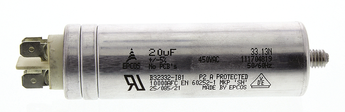 This is 20μF Polypropylene Capacitor PP 450V ac ±5% Tolerance Stud Mount B32332 Series manufactured by EPCOS. The manufacturer part number is B32332I6206J081. The given dimensions of the product include 30 (dia.) x 93mm. The product is available in stud mount configuration. The product b32332, is a highly preferred choice for users. In addition, the height is 93mm. It provides a 20µf of capacitance value. It carries a 450v ac of voltage. Whereas, the minimum operating temperature of the product is -25°c. It has a maximum operating temperature of +85°c. It features ±5% of tolerance value. The terminal is a stud mount type.
