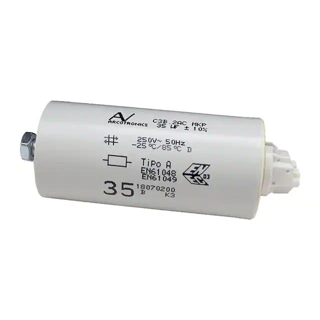 This is 35μF Polypropylene Capacitor PP 250V ac ±10% Tolerance Cable Mount C3B Series manufactured by KEMET. The manufacturer part number is C3B2AC55350B20K. The given dimensions of the product include 45 (dia.) x 94.5mm. The product is available in cable mount configuration. The product c3b, is a highly preferred choice for users. It provides a 35µf of capacitance value. Its accurate length is 94.5mm. It carries a 250v ac of voltage. Whereas, the minimum operating temperature of the product is -25°c. It has a maximum operating temperature of +85°c. It features ±10% of tolerance value. It is assigned with possible HTSUS value of 8532.25.0060. It is shipped in box. In addition, it is reach unaffected. Its typical moisture sensitivity level is not applicable. It has a long 29 weeks standard lead time. Moreover, it corresponds to c3b2ac, a base product number of the product. The product is designated with the ear99 code number