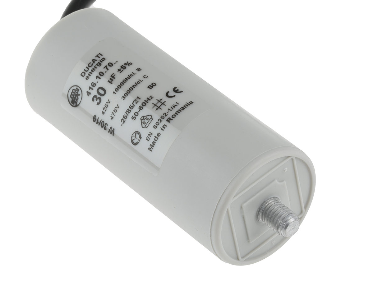 This is 30μF Polypropylene Capacitor PP 400 → 500V dc ±5% Tolerance Stud Mount 4.16.10 Series manufactured by Ducati Energia. The manufacturer part number is 4.16.10.70.14. The given dimensions of the product include 40 (dia.) x 92mm. The product is available in stud mount configuration. The product 4.16.10, is a highly preferred choice for users. In addition, the height is 92mm. It provides a 30µf of capacitance value. It carries a 400 → 500v ac of voltage. It features ±5% of tolerance value. The terminal is a flying leads type.