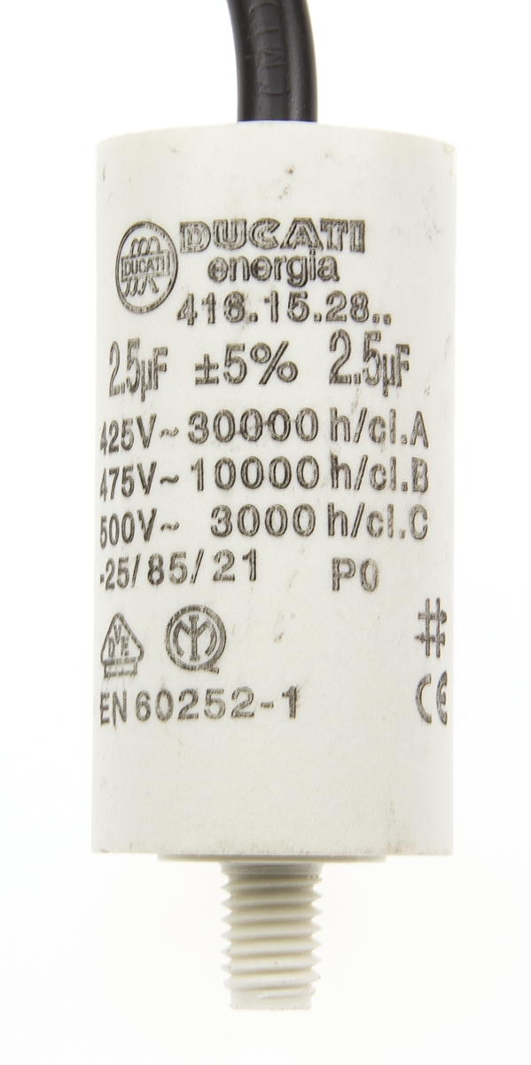 This is 2.5μF Polypropylene Capacitor PP 400 → 500V dc ±5% Tolerance Stud Mount 4.16.15 Series manufactured by Ducati Energia. The manufacturer part number is 4.16.15.28.14. The given dimensions of the product include 28 (dia.) x 55mm. The product is available in stud mount configuration. The product 4.16.15, is a highly preferred choice for users. In addition, the height is 55mm. It provides a 2.5µf of capacitance value. It carries a 400 → 500v ac of voltage. It features ±5% of tolerance value. The terminal is a flying leads type.
