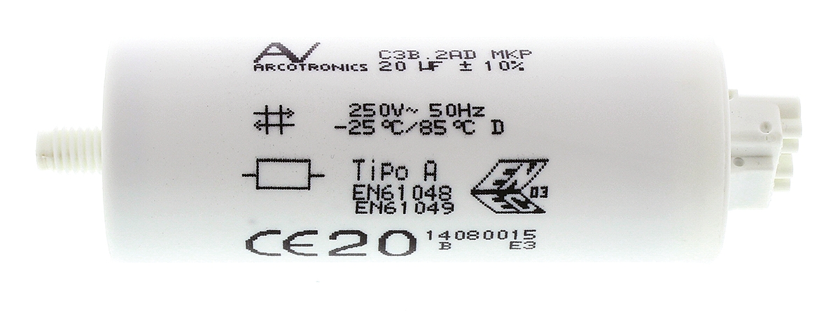 This is 20μF Polypropylene Capacitor PP 250V ac ±10% Tolerance Cable Mount C3B Series manufactured by KEMET. The manufacturer part number is C3B2AD45200B20K. The given dimensions of the product include 35 (dia.) x 95mm. The product is available in cable mount configuration. The product c3b, is a highly preferred choice for users. It provides a 20µf of capacitance value. Its accurate length is 95mm. It carries a 250v ac of voltage. Whereas, the minimum operating temperature of the product is -25°c. It has a maximum operating temperature of +85°c. It features ±10% of tolerance value.