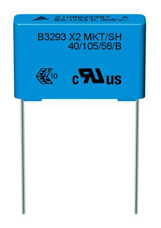 This is 560nF Polyester Capacitor PET 305V ac ±10% B3293 Series manufactured by EPCOS. The manufacturer part number is B32933A3564K000. The given dimensions of the product include 26.5 x 10.5 x 16.5mm. The product b3293, is a highly preferred choice for users. Its accurate length is 26.5mm. In addition, the height is 16.5mm. It provides a 560nf of capacitance value. The product comes in 10.5mm depth. It carries a 305v ac of voltage. It has a maximum operating temperature of +105°c. It features ±10% of tolerance value. The terminal is a radial type.