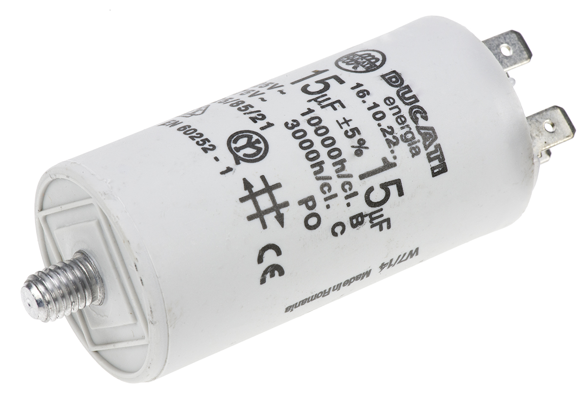 This is 15μF Polypropylene Capacitor PP 450V ac ±5% Tolerance Stud Mount 4.16.10 Series manufactured by Ducati Energia. The manufacturer part number is 4.16.10.22.64. The given dimensions of the product include 36 (dia.) x 70mm. The product is available in stud mount configuration. The product 4.16.10, is a highly preferred choice for users. In addition, the height is 70mm. It provides a 15µf of capacitance value. It carries a 450v ac of voltage. It features ±5% of tolerance value. The terminal is a flying leads type.