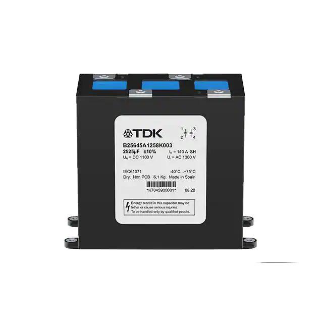 This is manufactured by EPCOS - TDK Electronics. The manufacturer part number is B25645A1108K003. 1800v (1.8kv) of DC voltage rating. It is assigned with possible HTSUS value of 8532.25.0080. The product is rohs3 compliant. It provides a 1025 µf of capacitance value. The product has -40°c ~ 75°c operating temperature range. Moreover, the product comes in [Package/ Case]. It features ±10% of tolerance value. It has the maximum seated height of 8.543" (217.00mm) Moreover, the product is constructed from highly polypropylene (pp) dielectric material. In addition, it is reach unaffected. The product is widely employed in dc link, dc filtering. It is shipped in bulk. The product's diameters include 8.661" l x 4.528" w (220.00mm x 115.00mm). The product features connector termination style. It has a long 22 weeks standard lead time. Its typical moisture sensitivity level is not applicable. The product is available in chassis mount configuration. The product modcap™ - medium frequency, is a highly preferred choice for users. The product is designated with the ear99 code number
