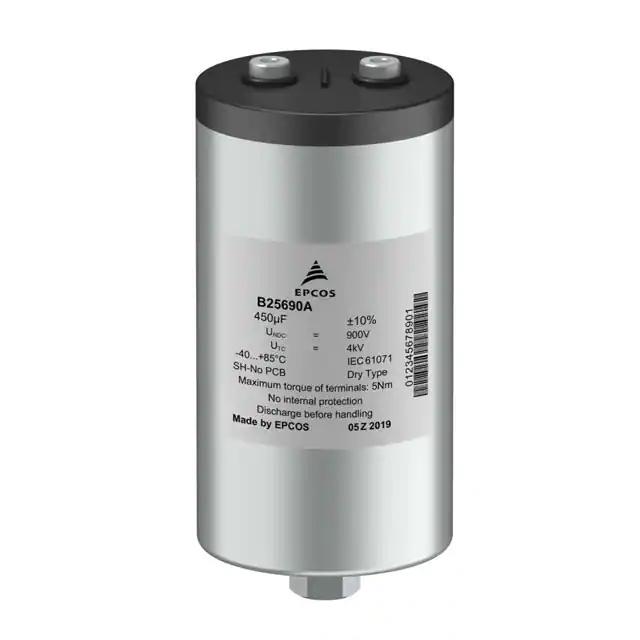 This is manufactured by EPCOS - TDK Electronics. The manufacturer part number is B25690A2367K003. 2000v (2kv) of DC voltage rating. It is assigned with possible HTSUS value of 8532.25.0070. The product is rohs3 compliant. It carries ESR (Equivalent Series Resistance) of 1.4 mohms. It provides a 360 µf of capacitance value. The product has -40°c ~ 75°c operating temperature range. Moreover, the product comes in [Package/ Case]. It features ±10% of tolerance value. It has the maximum seated height of 9.055" (230.00mm) In addition, it is reach unaffected. The product is widely employed in general purpose. It is shipped in bulk. The product's diameters include 4.567" dia (116.00mm). The product features threaded, female termination style. Its typical moisture sensitivity level is not applicable. The product is available in chassis mount configuration. The product mkp dc link - resin top, is a highly preferred choice for users. It is assigned with 1.969" (50.00mm) of lead spacing. The product is designated with the ear99 code number