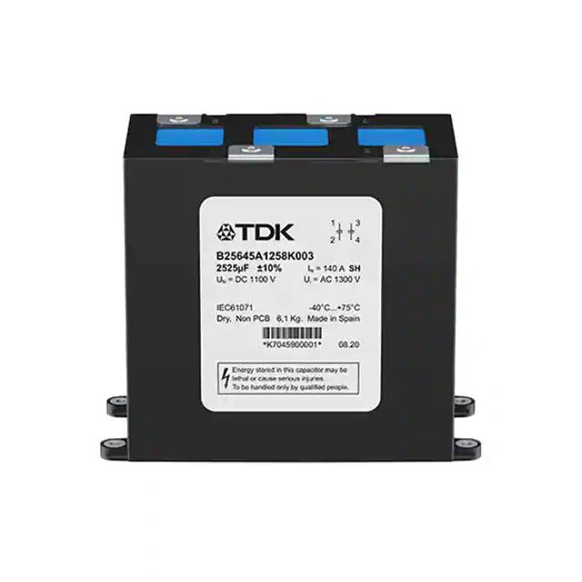 This is manufactured by EPCOS - TDK Electronics. The manufacturer part number is B25645A1178K003. 1000v (1kv) of DC voltage rating. It is assigned with possible HTSUS value of 8532.25.0040. The product is rohs3 compliant. It provides a 1700 µf of capacitance value. The product has -40°c ~ 75°c operating temperature range. Moreover, the product comes in [Package/ Case]. It features ±10% of tolerance value. It has the maximum seated height of 6.752" (171.50mm) Moreover, the product is constructed from highly polypropylene (pp) dielectric material. In addition, it is reach unaffected. The product is widely employed in dc link, dc filtering. It is shipped in bulk. The product's diameters include 8.071" l x 3.543" w (205.00mm x 90.00mm). The product features connector termination style. It has a long 22 weeks standard lead time. Its typical moisture sensitivity level is not applicable. The product is available in chassis mount configuration. The product modcap™ - medium frequency, is a highly preferred choice for users. The product is designated with the ear99 code number
