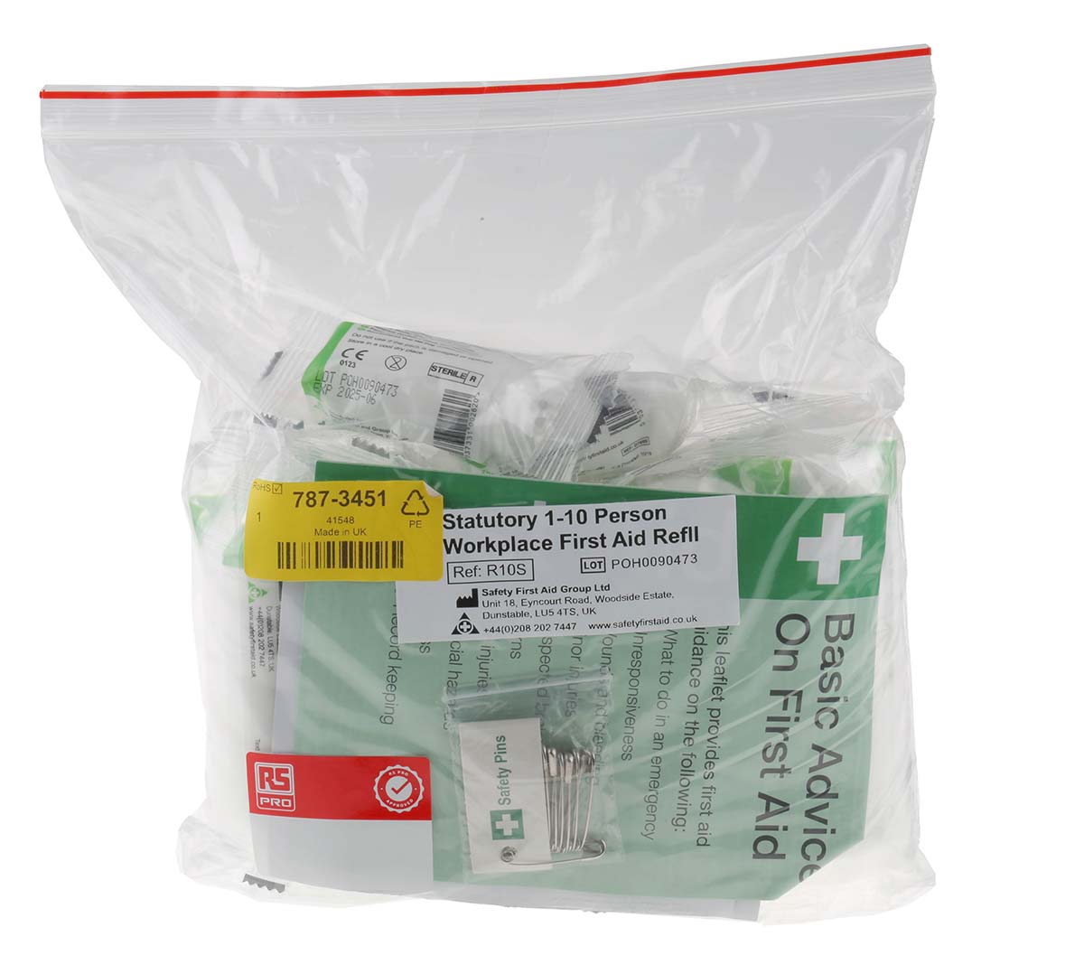 This is First Aid Refill Kit 10 Person Refill Kit manufactured by RS Pro. The manufacturer part number is 787-3451. It comes in 10 person refill kit configuration.