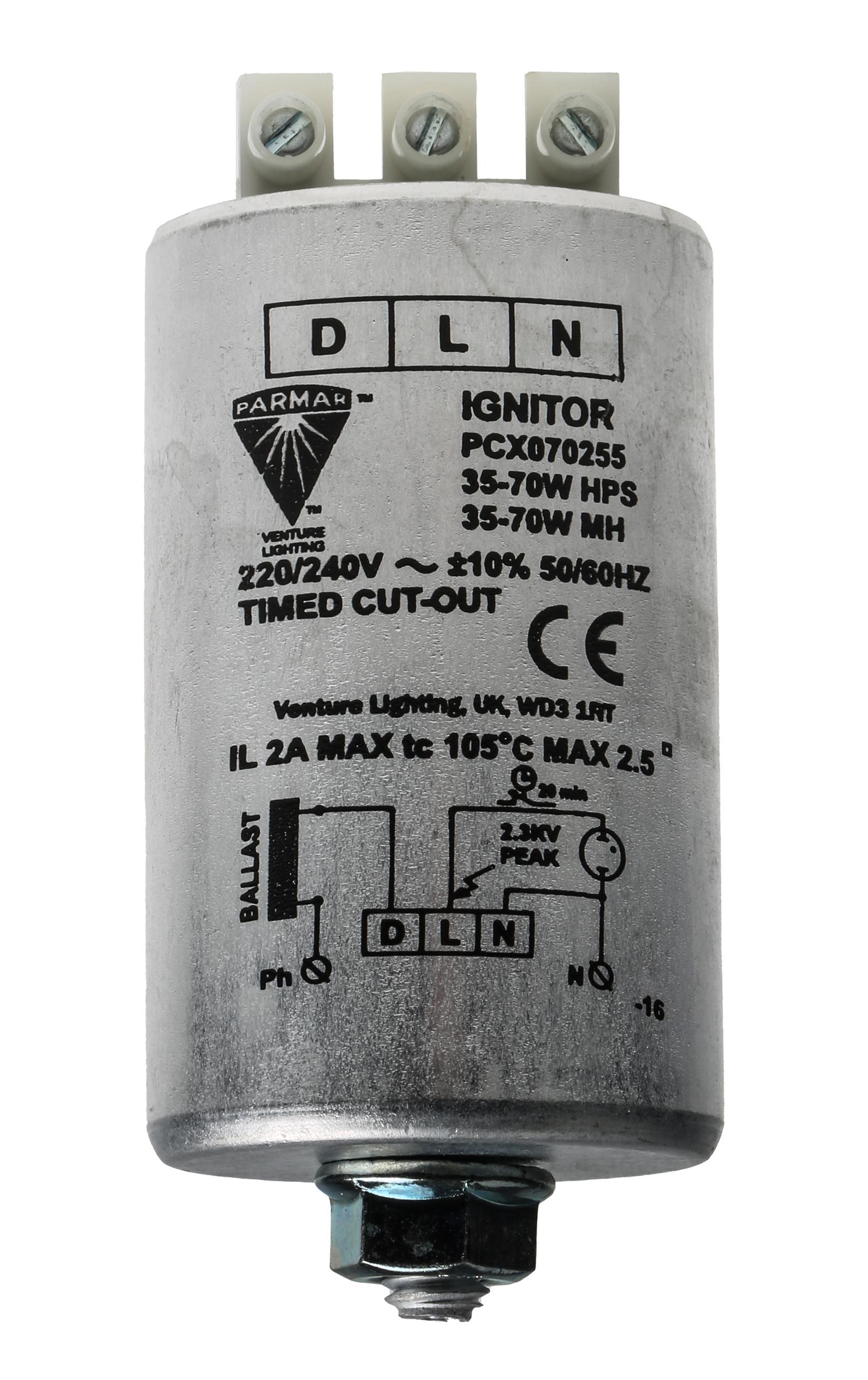 This is 35 → 70 W Lighting Ignitor Ceramic MH HPS Metal Halide manufactured by Parmar. The manufacturer part number is PCX070255. Its diameter is 40mm. Its accurate length is 75 mm.