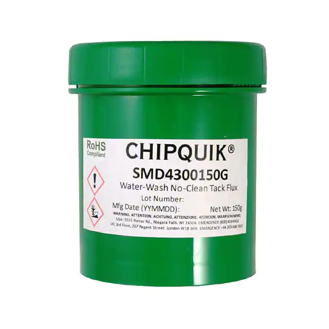 This is manufactured by Chip Quik Inc.. The manufacturer part number is SMD4300150G. It is assigned with possible HTSUS value of 3810.10.0000. The product is rohs3 compliant. The product is highly reliable with a long-lasting period of 24 months. It comes in flux - no clean, water-soluble configuration. The product is designed as a nice jar, 5.29 oz (150g). In addition, it is reach unaffected. Its warranty starts from date of manufacture. It offers storage features at 37°f ~ 77°f (3°c ~ 25°c). It is shipped in bulk. Its typical moisture sensitivity level is not applicable. It has a long 2 weeks standard lead time. The product chipquik®, is a highly preferred choice for users. The product is designated with the ear99 code number