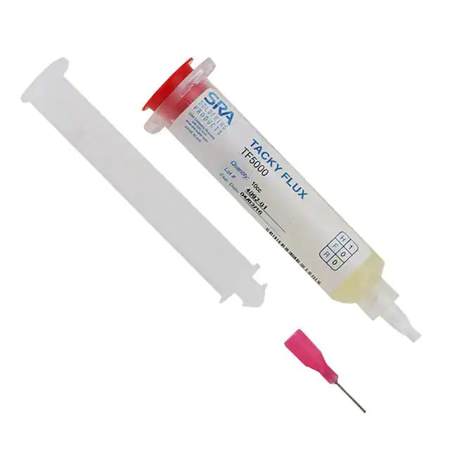 This is manufactured by SRA Soldering Products. The manufacturer part number is TF5000. The product is designed as a nice syringe, 0.35 oz (10g), 10cc. It is assigned with possible HTSUS value of 3810.10.0000. It is shipped in bag. The product is rohs compliant. In addition, it is reach unaffected. Its warranty starts from date of manufacture. The product is highly reliable with a long-lasting period of 24 months. Its typical moisture sensitivity level is 1 (unlimited). It has a long 3 weeks standard lead time. It comes in flux - no clean, tacky solder configuration. The product is designated with the ear99 code number