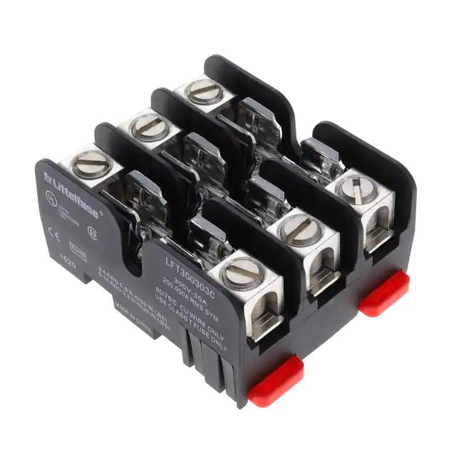 This is manufactured by Littelfuse Inc.. The manufacturer part number is LFT300303C. It is assigned with possible HTSUS value of 8536.90.8585. The product is rohs3 compliant. Moreover, it has box lug terminal style. In addition, it is reach unaffected. The product is suitable for use with class t fuses. It is shipped in box. A fuse with a 0.394" dia x 0.875" l (10mm x 22.23mm) size. Its typical moisture sensitivity level is 1 (unlimited). It has a long 17 weeks standard lead time. It integrates 3 circuits. Additionally, the product's output is 30 a The product is available in din rail configuration. block Fuse holder type. The product lft, is a highly preferred choice for users. It integrates a cartridge fuse type. It carries a 300v of voltage. The product is designated with the ear99 code number