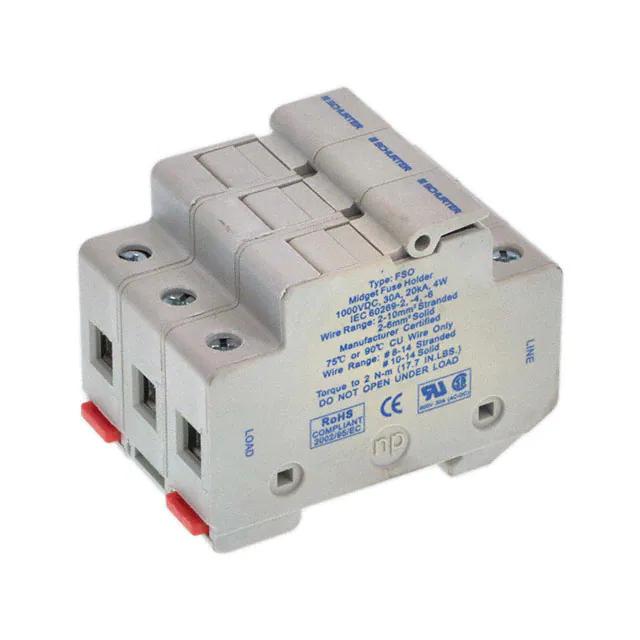 This is manufactured by Schurter Inc.. The manufacturer part number is 0091.0003. It is assigned with possible HTSUS value of 8538.90.8180. The product is rohs3 compliant. Moreover, it has screw terminal, pressure plate terminal style. In addition, it is reach unaffected. The product is suitable for use with 5ag, 13/32" x 1-1/2" (midget). It is shipped in bulk. A fuse with a 0.394" dia x 1.496" l (10mm x 38mm) size. Its typical moisture sensitivity level is not applicable. It has a long 26 weeks standard lead time. It integrates 1 circuits. Additionally, the product's output is 30 a The product is available in din rail configuration. holder Fuse holder type. The product fso, is a highly preferred choice for users. It integrates a cartridge fuse type. It carries a 600v of voltage. The product is designated with the ear99 code number