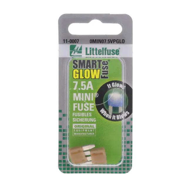 This is manufactured by Littelfuse Inc.. The manufacturer part number is 0MIN07.5VPGLO. It is assigned with possible HTSUS value of 8536.10.0040. The product is rohs3 compliant. 32 v of DC voltage rating. It is approved by sae, ul. Moreover, the product comes in [Package/ Case]. The product exhibits 32 v of AC voltage rating. In addition, it is reach unaffected. It responds within fast blow. It is shipped in bulk. The product's diameters include 0.429" l x 0.150" w x 0.346" h (10.90mm x 3.80mm x 8.80mm). It has a long 10 weeks standard lead time. Additionally, the product's output is 7.5 a Its typical moisture sensitivity level is not applicable. The product is available in requires holder configuration. It has a classic brown colour. The product mini®, is a highly preferred choice for users. It integrates a automotive fuse type. The product is designated with the ear99 code number