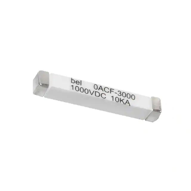 This is manufactured by Bel Fuse Inc.. The manufacturer part number is 0ACF-3000-TE. It is assigned with possible HTSUS value of 8536.10.0040. The product is rohs3 compliant. Whereas, the breaking capacity of the product at rated voltage is 10ka. 1 kv of DC voltage rating. The product has -40°c ~ 105°c operating temperature range. Moreover, the product comes in [Package/ Case]. In addition, it is reach unaffected. It has a 4 melting I²t. The DC cold resistance of the item is 0.09 ohms. It responds within fast blow. It is shipped in tape & reel (tr). The product's diameters include 1.260" l x 0.198" w x 0.198" h (32.00mm x 5.03mm x 5.03mm). It has a long 8 weeks standard lead time. Additionally, the product's output is 3 a Its typical moisture sensitivity level is 1 (unlimited). The product is available in surface mount configuration. The product 0acf, is a highly preferred choice for users. It integrates a board mount (cartridge style excluded) fuse type. Moreover, it corresponds to 0acf, a base product number of the product. The product is designated with the ear99 code number