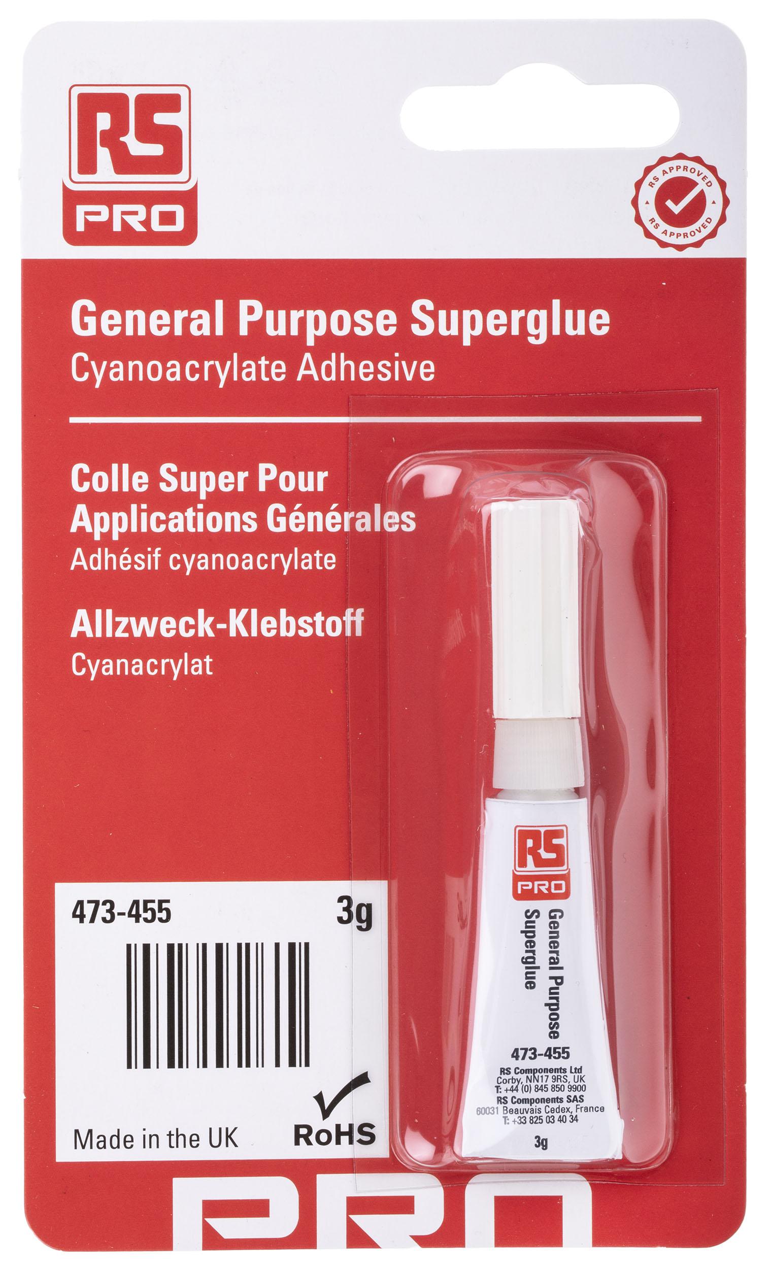 This is 3 g Super Glue manufactured by RS Pro. The manufacturer part number is 473-455. Whereas, the minimum operating temperature of the product is -50°c. It has a maximum operating temperature of +80°c.