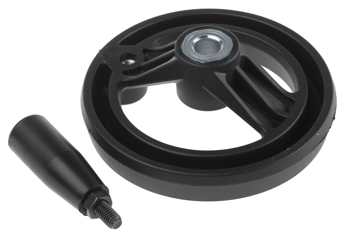 This is Black Glass-Fibre Reinforced Technopolymer Hand Wheel 100mm manufactured by RS Pro. The manufacturer part number is 161-1988. The given diameter of mounting hole is 10mm. While it is also supplied with highly stable steel insert material.