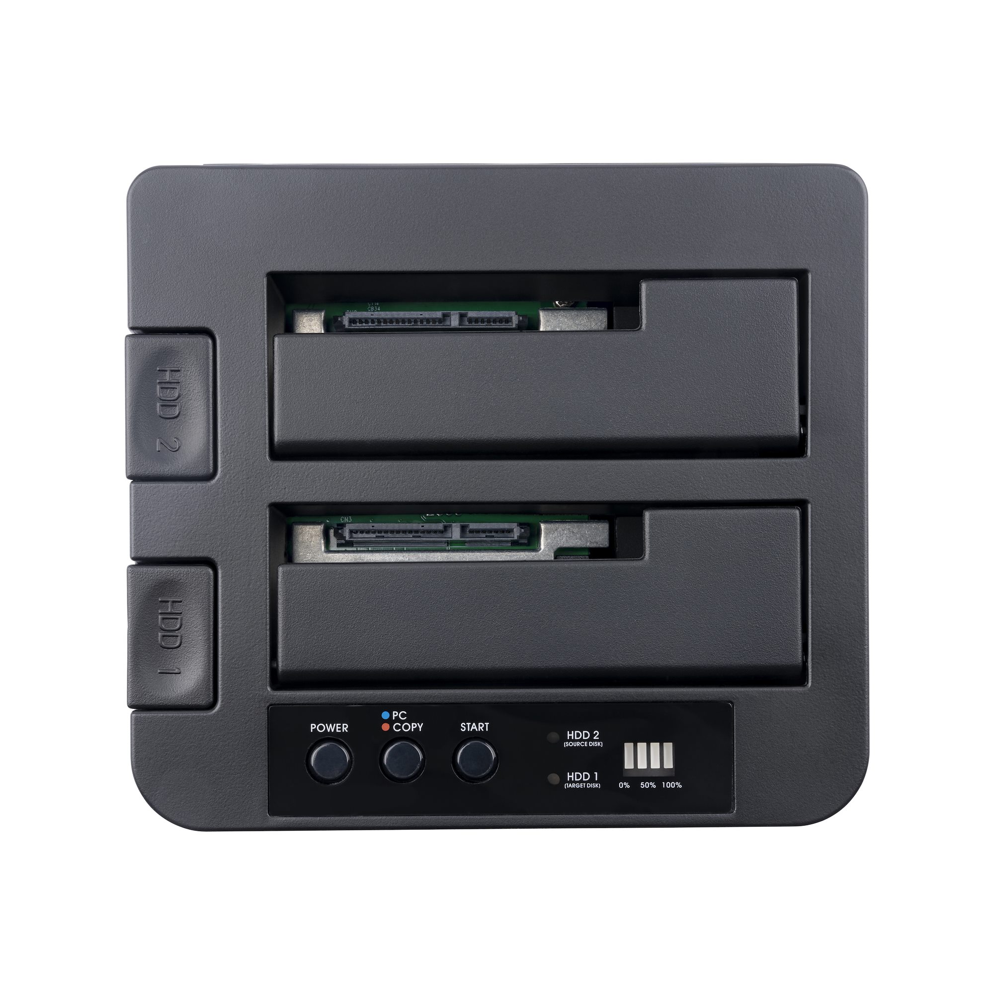 This is 2 port 2.5 in 3.5 in Hard Drive Duplicator Dock Hard Drive Dock Duplicator manufactured by StarTech.com. The manufacturer part number is SDOCK2U313R. The given dimensions of the product include 142 x 70 x 25.4mm.