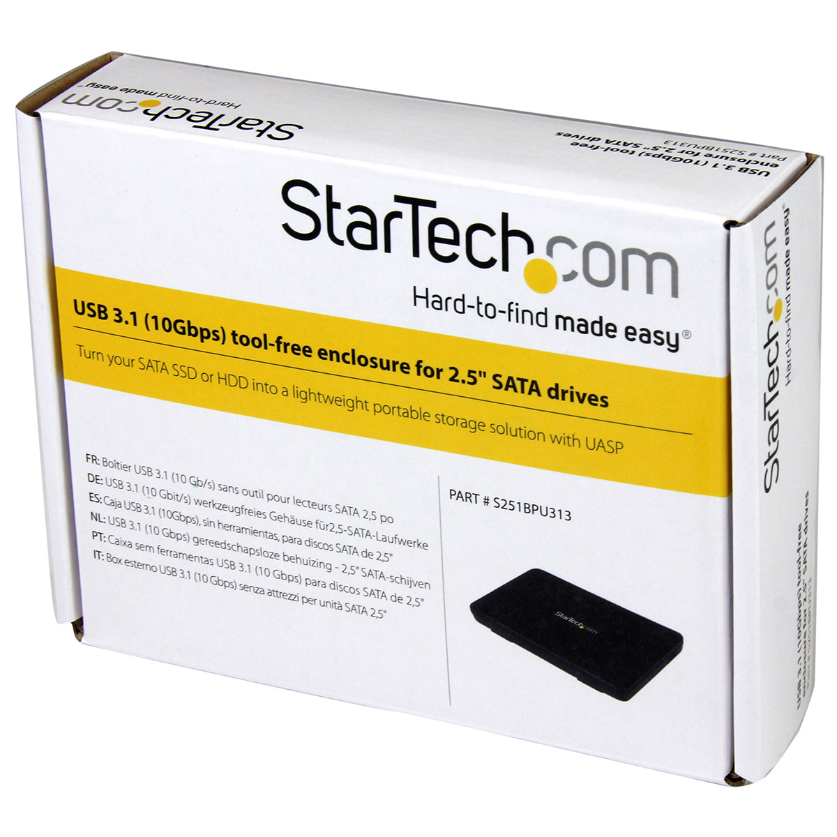 This is 2.5in SATA Hard Drive Enclosure USB 3.1 manufactured by StarTech.com. The manufacturer part number is S251BPU313. The given dimensions of the product include 132 x 15 x 88mm. The product's body is nicely designed from plastic materials. In addition, the height is 15mm. Furthermore, the product is 88mm wide. Its accurate length is 132mm. The product has a drive size of 2.5in.