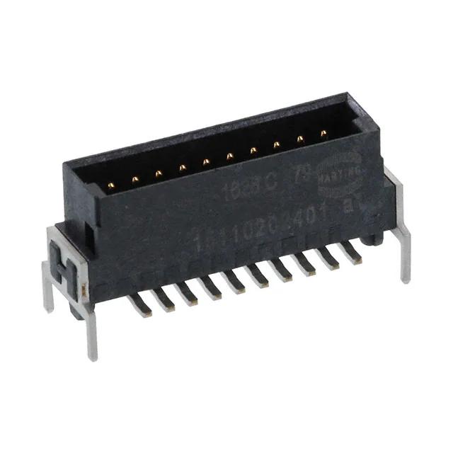 This is manufactured by HARTING. The manufacturer part number is 15110202401000. It has nice contact finishing of gold. Additionally, the product is designed with board to board or cable Style. It has possible tin contact post finishing. It is assigned with possible HTSUS value of 8536.69.4040. The product is rohs3 compliant. The product has -55°c ~ 125°c operating temperature range. The product carries possible position value of 20. 0.266" (6.76mm) of insulation height. In addition, it is reach unaffected. Furthermore, a bespoke product features shrouded - 4 wall. It comes in 2 of rows. It carries ul94 v-0 of material flammability rating. In addition, black is the insulation color of the product. It has a typical square shape. It is shipped in tape & reel (tr). It carries 0.050" (1.27mm) of row spacing. header Connector type offer robust functionality. It is 0.157" (4.00mm) contact mated. However, all is the Number of Positions Loaded. Its typical moisture sensitivity level is not applicable. Furthermore, push-pull is the Fastening Type of the product. The product features solder termination style. It has a long 12 weeks standard lead time. It has 0.050" (1.27mm) of pitch-mating value. The splendid features of the product include board guide, solder retention. The product is available in surface mount configuration. The product har-flex®, is a highly preferred choice for users. It has typical contact type of male pin. The product is made from sturdy copper alloy materials. It has a robust liquid crystal polymer (lcp) insulation material. The product is designated with the ear99 code number