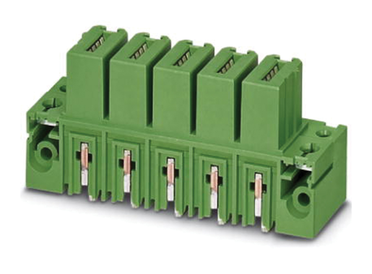 This is manufactured by Phoenix Contact. The manufacturer part number is 1793587. The product has a current rating of 125.0a. The product ipcv 35 hc/ 5-gf-15.00, is a highly preferred choice for users. Moreover, the product is 15.0mm The product contains 5 contacts. The product is made from sturdy silver materials. It is assigned with possible HTSUS value of 8536.69.4040. The product is rohs compliant. Moreover, it has solder terminal style. The product also features robust polybutylene terephthalate (pbt) housing material. It comes in header, blade sockets configuration. The product carries possible position value of 5. The typical tail length of the product is [Contact Tail Lenght]. 1.768" (44.90mm) of insulation height. It carries ul94 v-0 of material flammability rating. It is shipped in bulk. Its typical moisture sensitivity level is 1 (unlimited). An IEC current of 125a. While 600 v is the typical voltage of the product. It has a long 7 weeks standard lead time. The mating finish of the contact is silver. The nominal voltage of the product is 1 kv. The splendid features of the product include mating and mounting flange. The product is available in through hole configuration. It has a classic green colour. The product combicon ipcv, is a highly preferred choice for users. It has 5 positions each level. The product has a vertical of a header orientation. The typical current includes 115 a. Moreover, the product is 0.591" (15.00mm) The product carries 1 levels. The product is designated with the ear99 code number