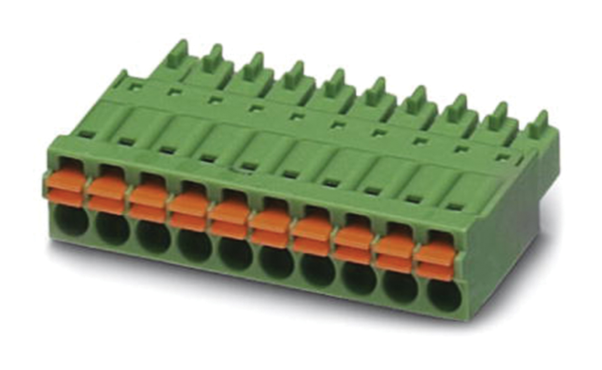 This is manufactured by Phoenix Contact. The manufacturer part number is 1748121. The product fmc 1.5/17-st-3.81, is a highly preferred choice for users. The product has a current rating of 8a. The product is available in cable mount configuration. Moreover, the product has a nominal 320 v voltage rating. In addition, female is the available "Gender" of the product. The product is made from highly stable and reliable polyamide, tin. Furthermore, the product is 65.21mm wide. The product comes in 7.8mm depth. It comes in 1 of rows. Moreover, the product is 3.81mm The product contains 17 contacts. It comes in plug configuration. It is assigned with possible HTSUS value of 8536.69.8000. The product is rohs compliant. Moreover, it has screwless - push-in spring terminal style. The product also features robust polyamide (pa), nylon housing material. The typical length of the wire strip is 10mm. It comes in plug, female sockets configuration. The product carries possible position value of 17. A 0.2-1.5mm² of wire gauge. It also a 180° plug wire entry. 0.307" (7.80mm) of insulation height. It carries ul94 v-0 of material flammability rating. It is shipped in bulk. Its typical moisture sensitivity level is 1 (unlimited). An IEC current of 8a. While 16-24 awg is its range or wire gauge. While 150 v is the typical voltage of the product. It has a long 34 weeks standard lead time. The mating finish of the contact is tin. The nominal voltage of the product is 320 v. The product is available in free hanging (in-line) configuration. It has a classic green colour. The product combicon fmc, is a highly preferred choice for users. It has 17 positions each level. The typical current includes 8 a. Moreover, the product is 0.150" (3.81mm) The product carries 1 levels. The product is designated with the ear99 code number