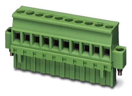This is manufactured by Phoenix Contact. The manufacturer part number is 1835559. The product has a current rating of 12a. Moreover, the product has a nominal 630 v voltage rating. The product mvstbr 2.5/10-stf, is a highly preferred choice for users. Moreover, the product is 5mm The product contains 10 contacts. It comes in connector configuration. The product is made from sturdy tin materials. It is assigned with possible HTSUS value of 8536.69.8000. The product is rohs compliant. Moreover, it has screw - rising cage clamp terminal style. The product also features robust polyamide (pa), nylon housing material. It is available in screw size of m3. The typical length of the wire strip is 7mm. It comes in plug, female sockets configuration. The product carries possible position value of 10. A 0.2-2.5mm² of wire gauge. It also a 90° plug wire entry. 1.024" (26.01mm) of insulation height. It carries ul94 v-0 of material flammability rating. It is shipped in bulk. Its typical moisture sensitivity level is 1 (unlimited). An IEC current of 12a. While 12-30 awg is its range or wire gauge. While 300 v is the typical voltage of the product. It carries torque - screw values of 0.5-0.6 nm (4.4-5.3 lb-in). It has a long 22 weeks standard lead time. The mating finish of the contact is tin. The nominal voltage of the product is 630 v. The splendid features of the product include mating flange, retention latches (wire side). The product is available in free hanging (in-line) configuration. It has a classic green colour. The product combicon mvstbr, is a highly preferred choice for users. It has 10 positions each level. The typical current includes 15 a. Moreover, the product is 0.197" (5.00mm) The product carries 1 levels. The product is designated with the ear99 code number