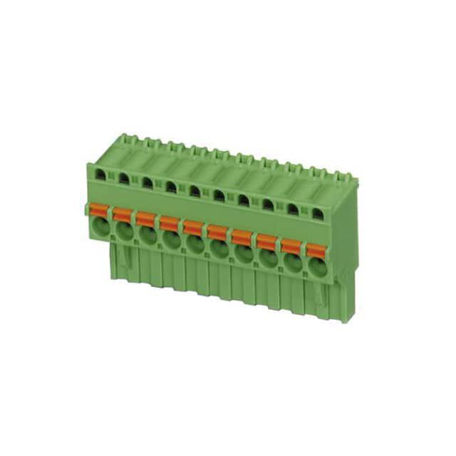 This is manufactured by Phoenix Contact. The manufacturer part number is 1909799. The product is made from highly stable and reliable polyamide, tin. The product has a current rating of 12a. Moreover, the product has a nominal 630 v voltage rating. In addition, female is the available "Gender" of the product. Moreover, the product is 5mm The product fkcvr 2.5/10-st, is a highly preferred choice for users. The product contains 10 contacts. It comes in plug configuration. It is assigned with possible HTSUS value of 8536.69.8000. The product is rohs3 compliant. Moreover, it has screwless - leg spring, push-in spring terminal style. The product also features robust polyamide (pa), nylon housing material. The typical length of the wire strip is 10mm. It comes in plug, female sockets configuration. The product carries possible position value of 10. A 0.2-2.5mm² of wire gauge. It also a 180° plug wire entry. 0.661" (16.80mm) of insulation height. In addition, it is reach unaffected. It carries ul94 v-0 of material flammability rating. It is shipped in bulk. Its typical moisture sensitivity level is 1 (unlimited). An IEC current of 12a. While 12-26 awg is its range or wire gauge. While 300 v is the typical voltage of the product. It has a long 10 weeks standard lead time. The mating finish of the contact is tin. The nominal voltage of the product is 630 v. The splendid features of the product include retention latches (non-wire side). The product is available in free hanging (in-line) configuration. It has a classic green colour. The product combicon fkcvr, is a highly preferred choice for users. It has 10 positions each level. The typical current includes 10 a. Moreover, the product is 0.197" (5.00mm) The product carries 1 levels. The product is designated with the ear99 code number