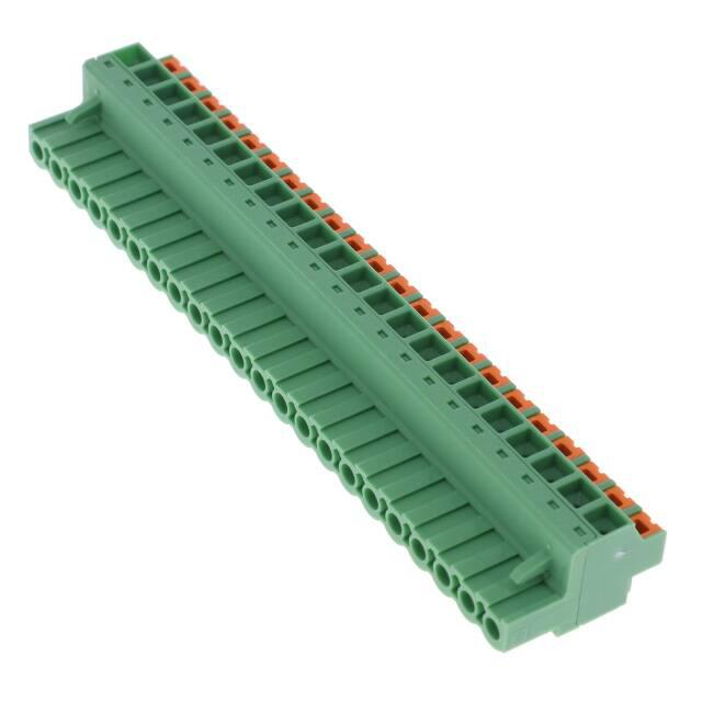 This is manufactured by Phoenix Contact. The manufacturer part number is 1861438. It is assigned with possible HTSUS value of 8536.69.8000. The product is rohs compliant. Moreover, it has screwless - leg spring, push-in spring terminal style. The product also features robust polyamide (pa), nylon housing material. The typical length of the wire strip is 10mm. It comes in plug, female sockets configuration. The product carries possible position value of 21. A 0.2-2.5mm² of wire gauge. It also a 90° plug wire entry. 0.933" (23.70mm) of insulation height. It carries ul94 v-0 of material flammability rating. It is shipped in bulk. Its typical moisture sensitivity level is not applicable. An IEC current of 12a. While 12-26 awg is its range or wire gauge. While 300 v is the typical voltage of the product. It has a long 14 weeks standard lead time. The mating finish of the contact is tin. The nominal voltage of the product is 320 v. The splendid features of the product include lever actuated, retention latches (wire side). The product is available in free hanging (in-line) configuration. It has a classic green colour. The product combicon fkcor, is a highly preferred choice for users. It has 21 positions each level. The typical current includes 12 a. Moreover, the product is 0.200" (5.08mm) The product carries 1 levels. The product is designated with the ear99 code number