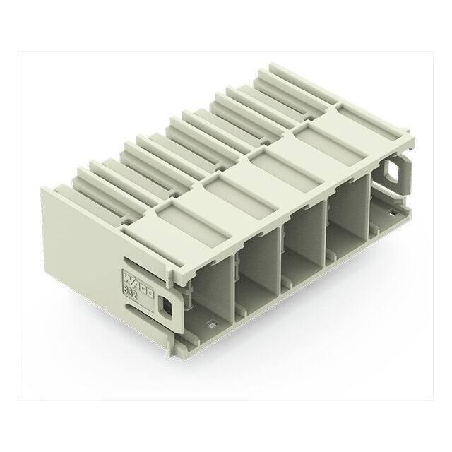 This is manufactured by WAGO Corporation. The manufacturer part number is 832-3625. It is assigned with possible HTSUS value of 8536.90.4000. The product is rohs3 compliant. Moreover, it has solder terminal style. The product also features robust polybutylene terephthalate (pbt) housing material. The product has -60°c ~ 120°c operating temperature range. It comes in header, male pins, shrouded (4 side) configuration. The product carries possible position value of 5. The typical tail length of the product is [Contact Tail Lenght]. 0.650" (16.50mm) of insulation height. It carries ul94 v-0 of material flammability rating. It is shipped in box. Its typical moisture sensitivity level is 1 (unlimited). An IEC current of 76a. While 600 v is the typical voltage of the product. It has a long 12 weeks standard lead time. The mating finish of the contact is silver. The nominal voltage of the product is 1 kv. The product is available in through hole configuration. It has a classic gray colour. The product mcsmaxi 16, is a highly preferred choice for users. It has 5 positions each level. The product has a 90°, right angle of a header orientation. The typical current includes 85 a. Moreover, the product is 0.400" (10.16mm) The product carries 1 levels. The product is made from sturdy electrolytic copper materials. The product is designated with the ear99 code number