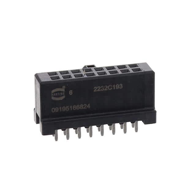 This is manufactured by HARTING. The manufacturer part number is 09195166824. It has nice contact finishing of gold. Additionally, the product is designed with board to board or cable Style. It has possible tin contact post finishing. It is assigned with possible HTSUS value of 8536.69.4040. The product is rohs3 compliant. The product has -55°c ~ 125°c operating temperature range. The product carries possible position value of 16. 0.114" (2.90mm) is the given possible contact length (post) values. 0.455" (11.56mm) of insulation height. It comes in 2 of rows. It carries ul94 v-0 of material flammability rating. In addition, black is the insulation color of the product. It has a typical square shape. It is shipped in bulk. It carries 0.100" (2.54mm) of row spacing. receptacle Connector type offer robust functionality. However, all is the Number of Positions Loaded. Its typical moisture sensitivity level is 1 (unlimited). Furthermore, push-pull is the Fastening Type of the product. The product features solder termination style. It has a long 8 weeks standard lead time. Additionally, the product's output is 1a It has 0.100" (2.54mm) of pitch-mating value. The product is available in through hole configuration. The product sek, is a highly preferred choice for users. It has typical contact type of female socket. The product is made from sturdy copper alloy materials. It has a robust liquid crystal polymer (lcp) insulation material. The product is designated with the ear99 code number