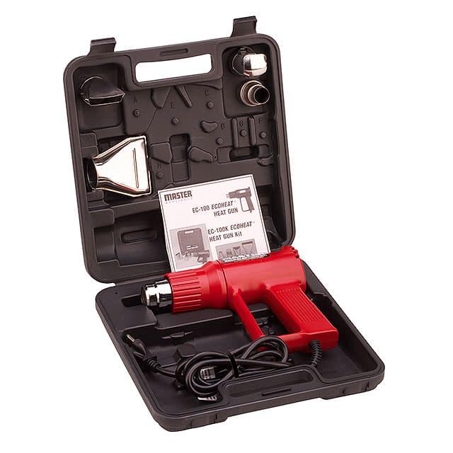 This is manufactured by Master Appliance Co. The manufacturer part number is EC-100K. It is assigned with possible HTSUS value of 8516.79.0000. The product is not applicable. It features a power rating of 1200w. Features a 10 a current in A. It has a 7.0 cfm, 9.0 cfm air flow rate. In addition, it is reach unaffected. The product is also supplied with heat gun, case, 4 nozzles. The product's typical temperature range incudes 500°f, 1000°f (260°c, 538°c). This is basically a useful and handy heat gun kit. It is shipped in bulk. Its typical moisture sensitivity level is not applicable. The splendid features of the product include 6' cord, built-in base, resettable thermostat. The typical product's weight is 5 lbs (2.3 kg). It has a classic red colour. The product ecoheat®, is a highly preferred choice for users. It carries a 120v of voltage. The product is designated with the ear99 code number
