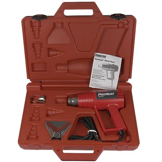 This is manufactured by Master Appliance Co. The manufacturer part number is PH-2100-A5K. It is assigned with possible HTSUS value of 8516.79.0000. The product is not applicable. It features a power rating of 1426w. Features a 6.2 a current in A. It has a 16.0 cfm air flow rate. The product is also supplied with heat gun, case, 2 nozzles. The product's typical temperature range incudes 500°f, 1000°f (260°c, 538°c). This is basically a useful and handy heat gun kit. It is shipped in box. Its typical moisture sensitivity level is not applicable. The splendid features of the product include 6' cord, built-in base, dual temperature. The typical product's weight is 3 lbs (1.4 kg). It has a classic red colour. The product proheat® dualtemp™ ph, is a highly preferred choice for users. It carries a 230v of voltage. The product is designated with the ear99 code number
