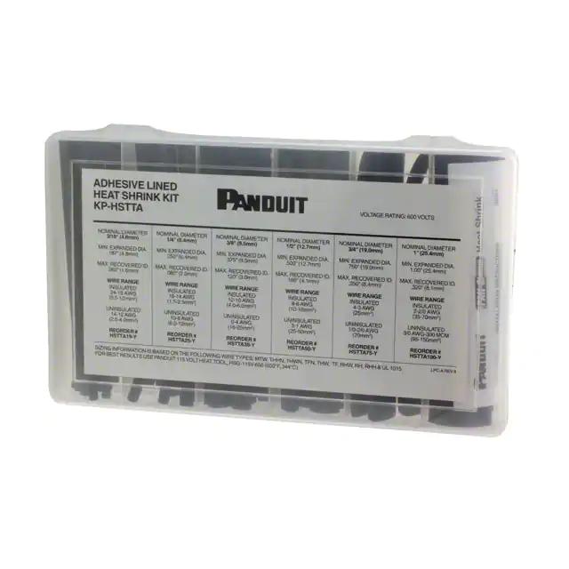 This is manufactured by Panduit Corp. The manufacturer part number is KP-HSTTA. Its diameter is 14 ea of 3/16", 12 ea of 1/4", 10 ea of 3/8:, 6 ea of 1/2", 3 ea of 3/4", 2 ea of 1". Its typical moisture sensitivity level is not applicable. It is assigned with possible HTSUS value of 3926.90.9985. It is shipped in case. It has a classic black colour. The product damp-shrink™, is a highly preferred choice for users. The product is rohs3 compliant. In addition, it is reach unaffected. Moreover, it corresponds to kp-h, a base product number of the product. It has a long 4 weeks standard lead time. The product is designated with the ear99 code number