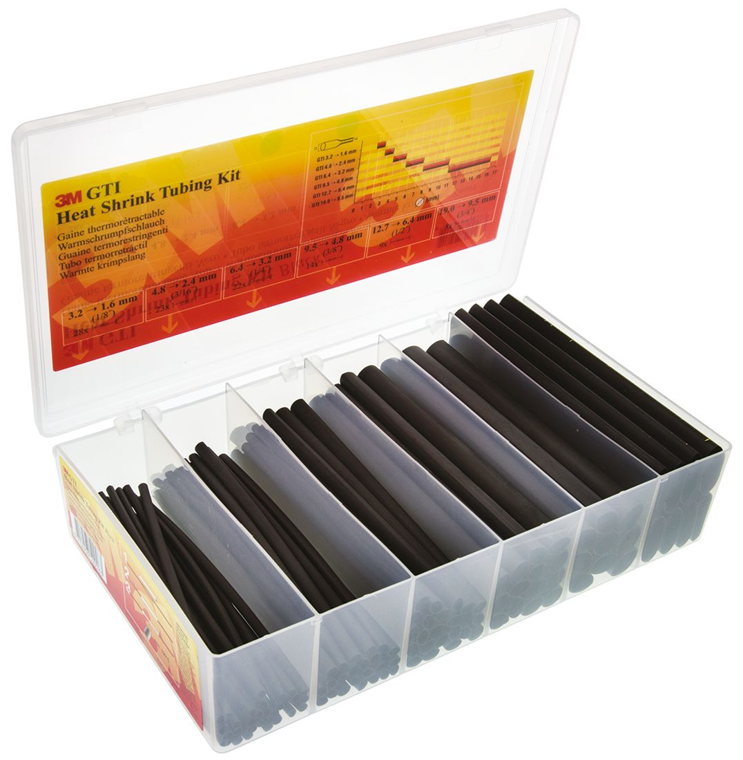 This is Black Heat Shrink Tubing Kit 3.2 mm 4.8 mm 6.4 mm 9.5 mm 12.7 mm 19 mm Sleeve Dia. x 150mm GTI Series manufactured by 3M. The manufacturer part number is 857760. The product gti, is a highly preferred choice for users. The product is made from highly stable and reliable polyolefin.