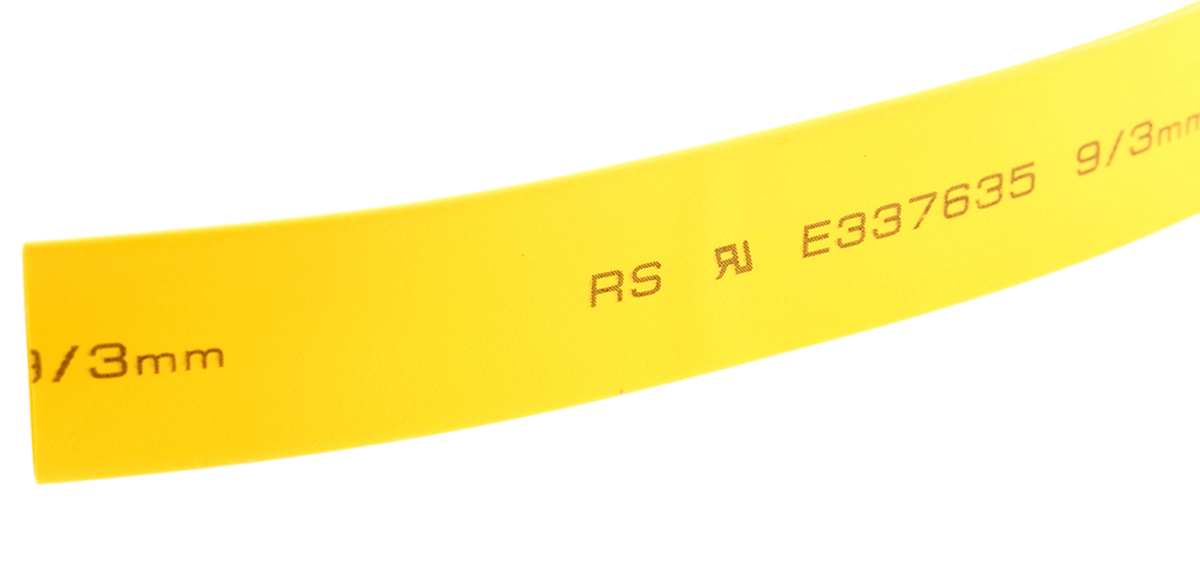 This is Yellow 3:1 Heat Shrink Tubing 9mm Sleeve Dia. x 5m Length manufactured by RS Pro. The manufacturer part number is 700-4472. The product is made from highly stable and reliable polyolefin.