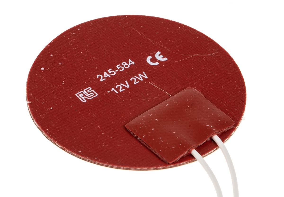 This is Silicone Heater Mat 2 W 12 V dc manufactured by RS Pro. The manufacturer part number is 245-584. The given dimensions of the product include 50 mm.