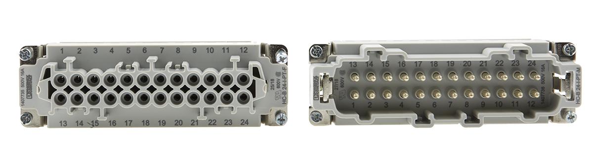 This is manufactured by Phoenix Contact. The manufacturer part number is 1411490. The product has a current rating of 16a. Moreover, the product has a nominal 500 v voltage rating. In addition, female, male is the available "Gender" of the product. It has a typical thread size of m32. The product hc, is a highly preferred choice for users. The product contains 24 contacts. Additionally, the product is designed with side-hood, bottom-base Style. It is assigned with possible HTSUS value of 8536.69.8000. The product is rohs compliant. Moreover, it has push in terminal style. The product carries possible position value of 24+ground. The product is also supplied with 5 pcs - 1 base, 1 cable gland, 2 inserts, 1 housing. It is shipped in bulk. Its typical moisture sensitivity level is 1 (unlimited). It has a long 10 weeks standard lead time. The product heavycon®, is a highly preferred choice for users. The product is available in b24 size. Contents Include: cable and panel connector assembly. The product is designated with the ear99 code number